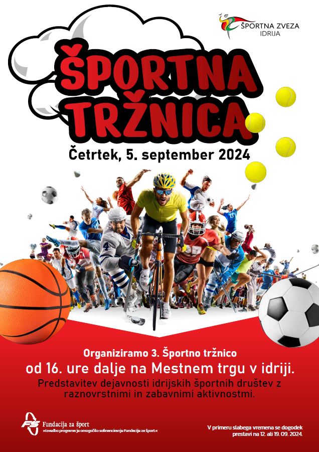 Zaradi slabe vremenske napovedi Športno tržnico ponovno prestavljamo. Tokrat na četrtek, 19. septembra!